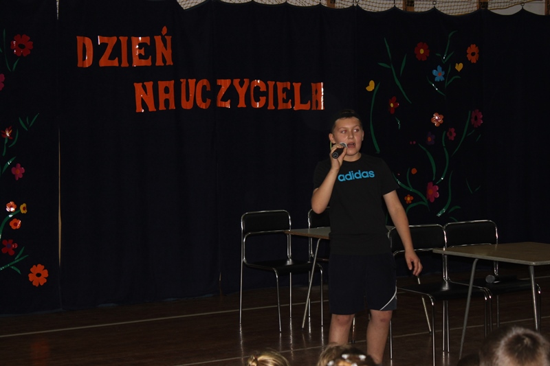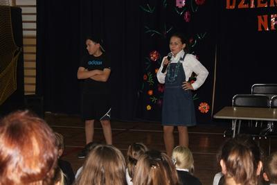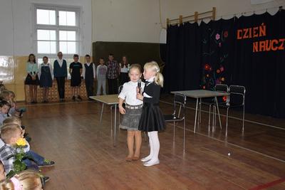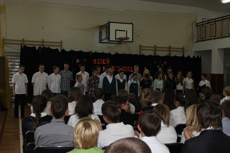 Utrzymane w lekkim i zabawnym stylu występy uczniów zakończyły się życzeniami dla wszystkich nauczycieli i pracowników szkoły złożonymi przez dwie pierwszoklasistki oraz piosenką wykonaną przez uczniów kl. III gimnazjum i kl. V szkoły podstawowej. Nie zabrakło też kwiatów i czekoladek dla wszystkich, którzy tego dnia obchodzili swoje święto.