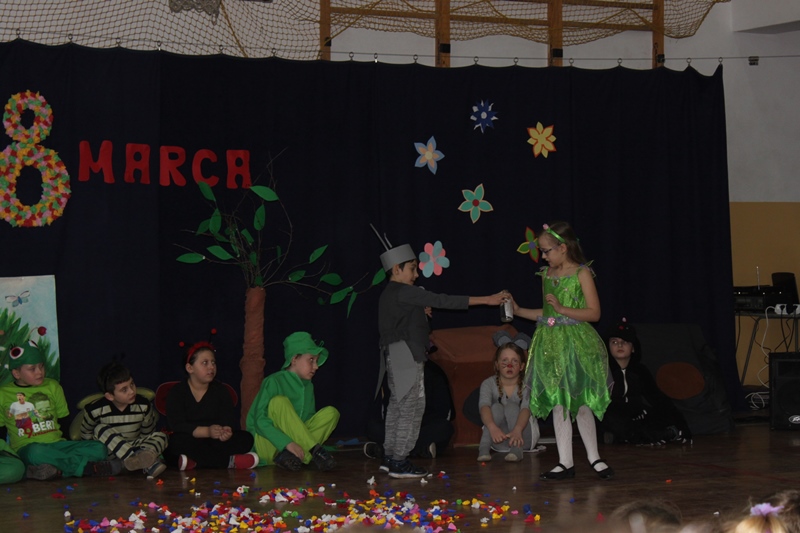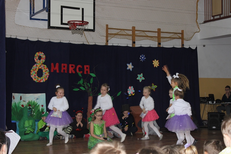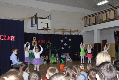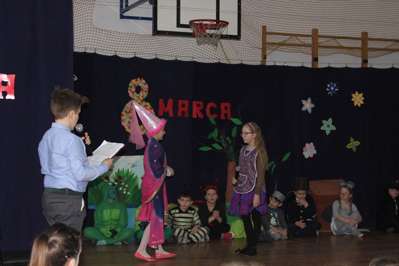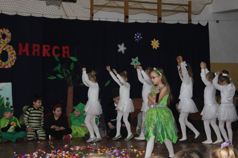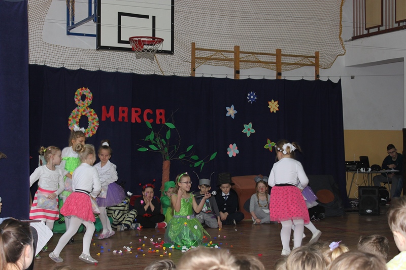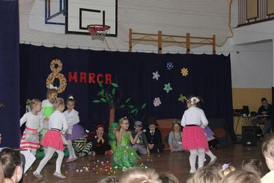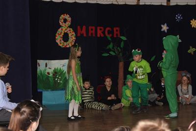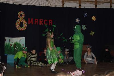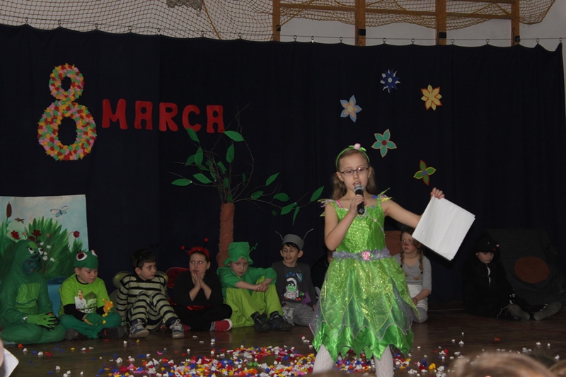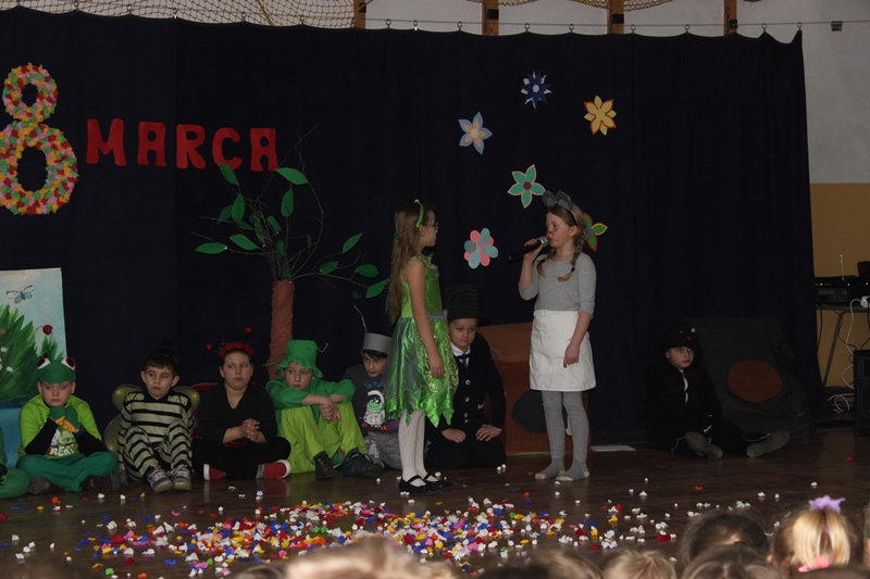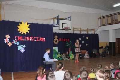 8 marca w naszej szkole nauczycielki klas młodszych Barbara Piątyszek i Elżbieta Marcinkowska tradycyjnie z uczniami swoich klas przygotowały inscenizację. W tym roku postanowiły zaprezentować lekturę pt.:"Calineczka". Uroczystość rozpoczęła uczennica gimnazjum Julia Golon piosenką Majki Jeżowskiej. Uczniowie wcielili się w role z wielkim zaangażowaniem i entuzjazmem. Nagrodzono ich gromkimi brawami. Na koniec z życzeniami, śpiewem i grą wystąpili chłopcy z gimnazjum. Wszystkie Panie zostały obdarowane kwiatami.