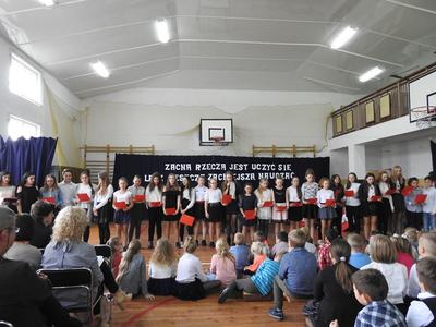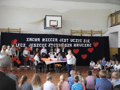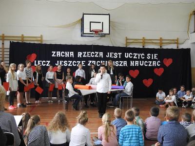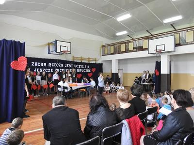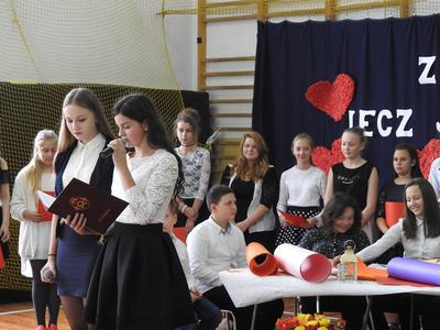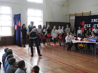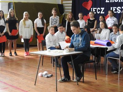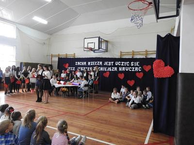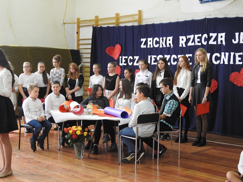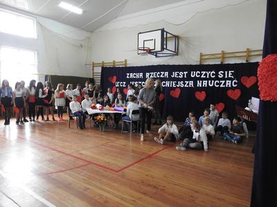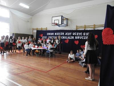 Uczniowie trzeciej gimnazjum postanowili odciążyć ich od codziennych obowiązków i w zamian za nich poprowadzić lekcje w młodszych klasach. Myślę, że w miarę dobrze poradzili sobie w rolach nauczycieli oraz, że zaciekawili rówieśników przygotowanymi zadaniami. Na drugiej lekcji odbył się apel przygotowany przez Samorząd Uczniowski. III klasa, przygotowana przez Panią Małgorzatę Wojdziak oraz przez Panią Agnieszkę Dydo także chciała podziękować nauczycielom i przedstawili piękny taniec z sercami. Na sam koniec klasa II gimnazjum z Panią Joanną Magdziarz na czele przedstawiła dwa skecze, które bardzo zaskoczyły oraz rozbawiły nauczycieli i uczniów.