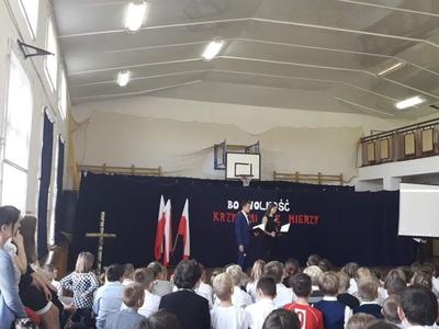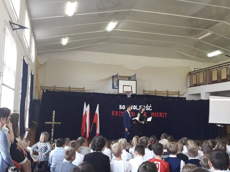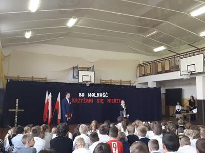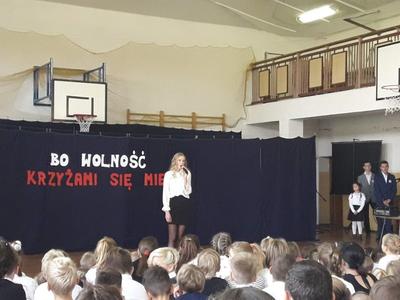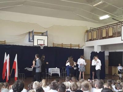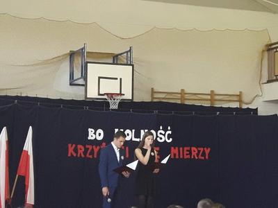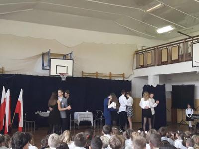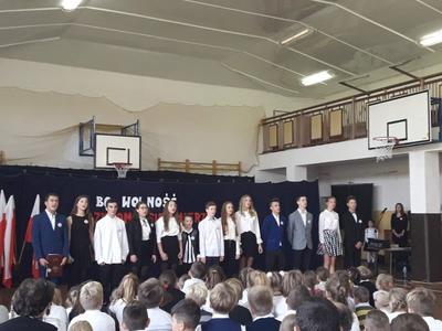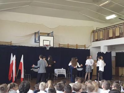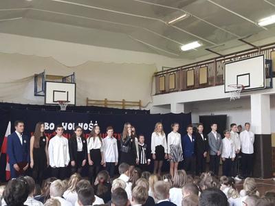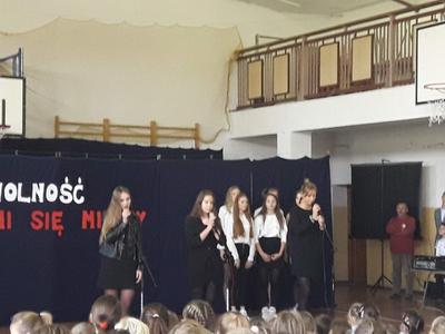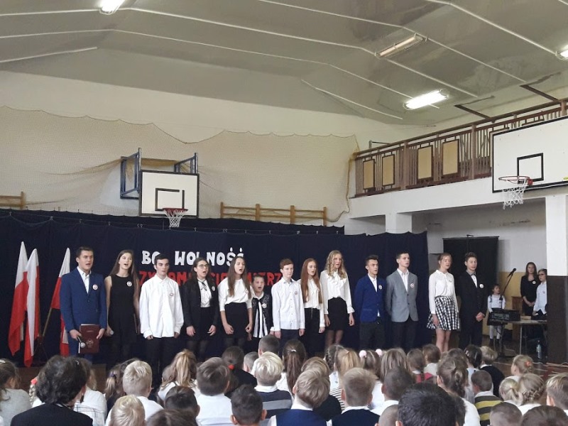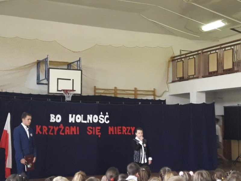 Występ rozpoczęliśmy hymnem narodowym, który wspólnie odśpiewaliśmy w całości. Tym akcentem chcieliśmy podkreślić, że jest to okrągła – 100. rocznica Niepodległej Polski. Wszystko było dopracowane - oryginalny tytuł, dekoracja sali oraz inscenizacja. Niespodzianką dla publiczności był z pewnością występ trzech niezwykle utalentowanych dziewczyn, które dawniej były uczennicami naszej szkoły. W utworze ,,Panie Generale” wystąpiły: Aleksandra Dolna, Julia Golon oraz Aleksandra Godawa. Z ich udziałem akademia była bardziej urozmaicona oraz ukazana w niesamowitej atmosferze. Również należy wspomnieć o naszych młodszych koleżankach: Zuzi Szladze i Zuzi Mące, które swoimi występami zaczarowały publiczność. Na pomoc w tej ważnej dla nas uroczystości mogliśmy liczyć ze strony Amelii Porębskiej i Kacpra Dubiaka. Bardzo dziękujemy wszystkim, którzy zgodzili się wystąpić i poświęcili swój czas.
