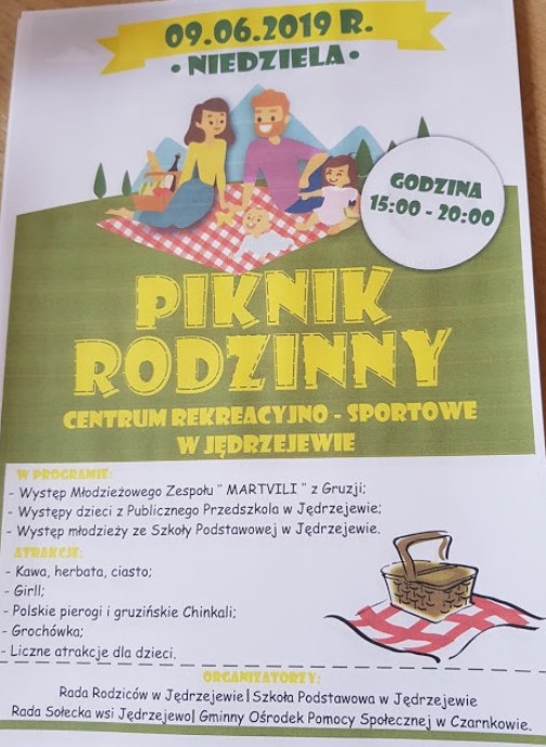 W dniach 04.06. – 11.06.2019r. zorganizowany został w Jędrzejewie Międzynarodowy Tydzień Kultury. Projekt realizowany w ramach programu Erasmus+. W jego realizacji bierze udział polska młodzież z Jędrzejewa, ze Szkoły Podstawowej w Jędrzejewie oraz młodzież gruzińska z miejscowości Martvili, ze szkoły No 1 Public School of Martvili. Najważniejszym celem naszego projektu jest promocja i popularyzacja kultury ludowej wśród młodzieży wsi Jędrzejewo poprzez wspólne warsztaty z partnerem z Gruzji. Zwieńczeniem projektu będzie występ młodzieży podczas Pikniku Rodzinnego w Jędrzejewie.