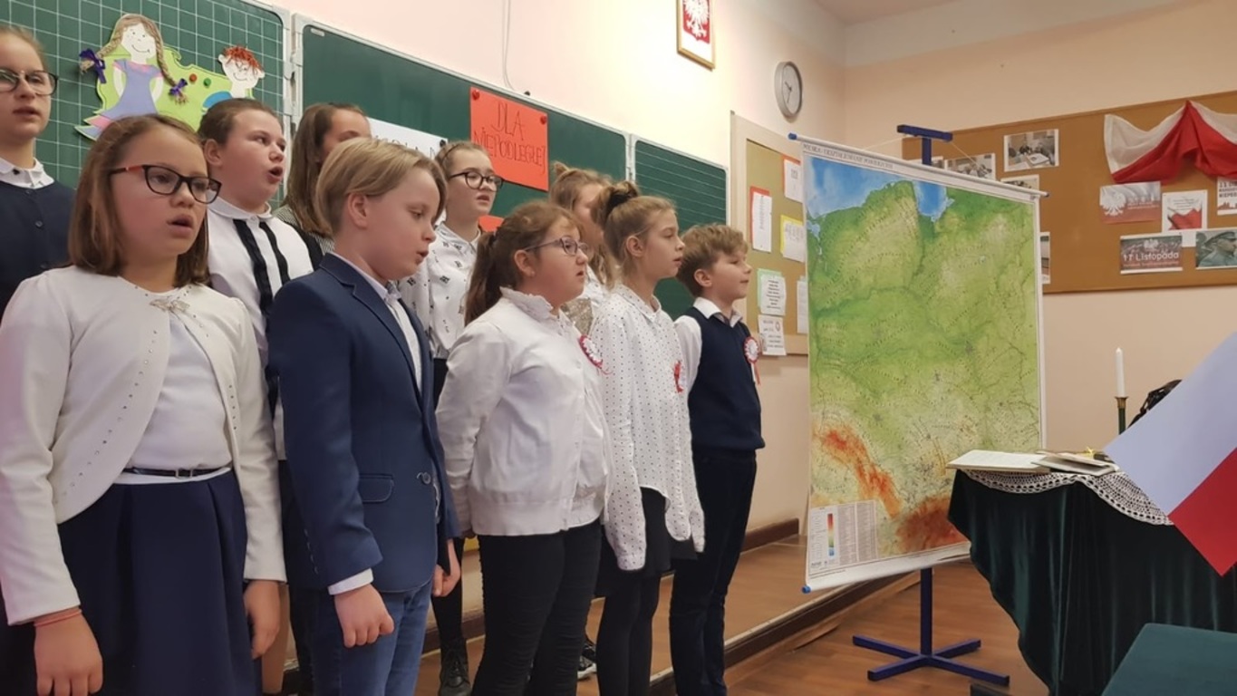Piękny nastrój wprowadziła Zuzia Mąka, która zaśpiewała piosenkę „Rozkwitały pąki białych róż”. Po występie Zuzi przyszedł czas na pierwszą kategorię uczestników – klasy I – III. Wystąpiło w niej ośmioro uczniów. W kategorii klas IV – VI wystąpiło dziewięcioro uczniów, a w ostatniej odsłonie (kategoria VII – VIII) – pięcioro uczestników. W przerwach między recytacjami prowadzący akademię przypomnieli nam, w jaki sposób Polska odzyskała niepodległość, a część uczniów klasy V zaśpiewała pieśń „Szara Piechota”. Konkurs zakończył się piosenką wykonaną przez braci Michała i Janka Rajek oraz – oczywiście – wspólną fotografią nagrodzonych uczestników.