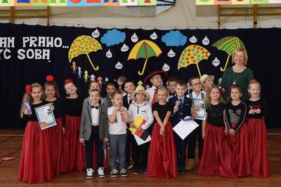Niesamowicie zdolne pierwszaki, pod okiem swojej wychowawczyni, p. Agnieszki Dydo, przygotowały swój program artystyczny w oparciu o hasło „Mam prawo… być sobą”. Wszystkie wiersze, piosenki i scenki podporządkowane były tematyce związanej z wolnością, tolerancją, prawem do życia, radości, szczęścia… Uczniowie z przekonaniem i zrozumieniem mówili o tym, kiedy powiedzieć „nie” różnym przejawom agresji. Pokazali też, że nie jest im obce pojęcie szacunku dla różnych narodowości. Dziewczęta zatańczyły niczym hiszpańskie tancerki, co wzbudziło zachwyt całej publiczności. Piosenka, którą wykonała Zuzia Mąka z kl. V - „Wszystkie dzieci nasze są” Majki Jeżowskiej - była niczym podsumowanie.