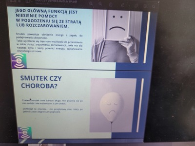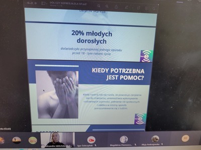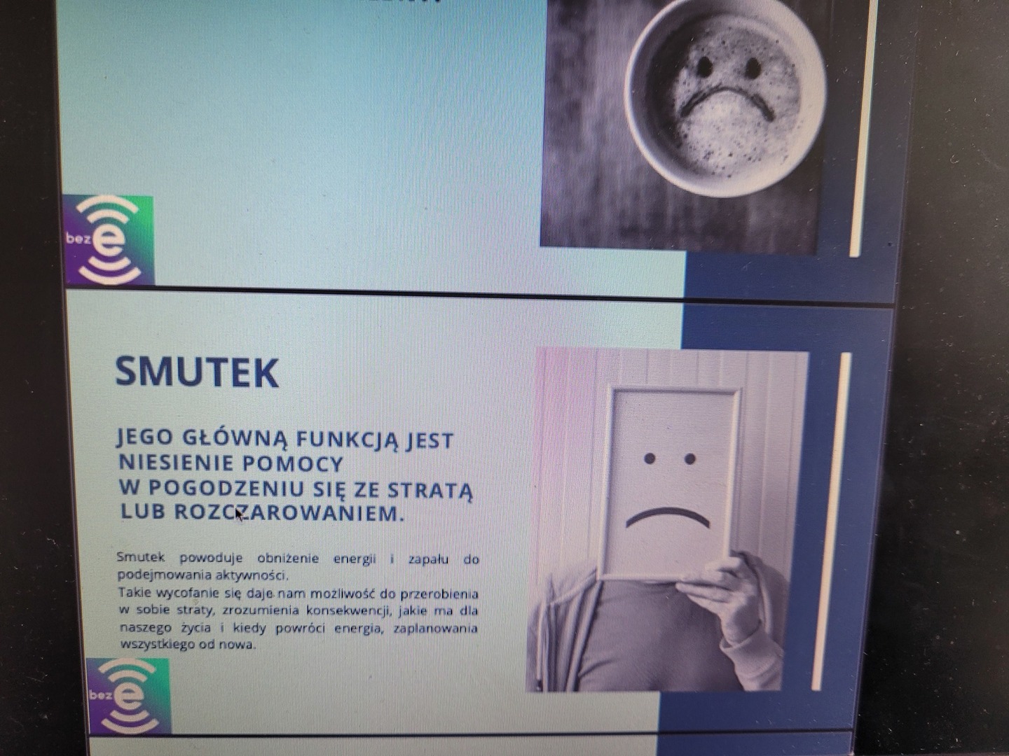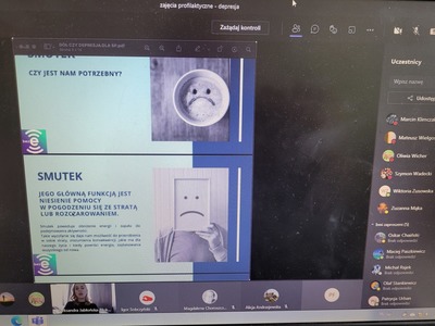 Podczas zajęć uczniowie dowiedzieli się czym jest smutek, jak odróżnić zwyczajny dół od depresji, a także jak pomóc koledze/koleżance, który cierpi na depresję (czego nie wolno mówić, a jak należy wspierać). Uczniowie chętnie i z zaangażowaniem brali udział w dyskusji. Z zajęć wynieśli bardzo wartościową wiedzę, że depresja nie jest słabością, ani wadą osobowości. Jest to choroba, która mocno wpływa na relacje międzyludzkie oraz wymaga ze strony otoczenia ogromnej empatii ukierunkowanej na chorego
