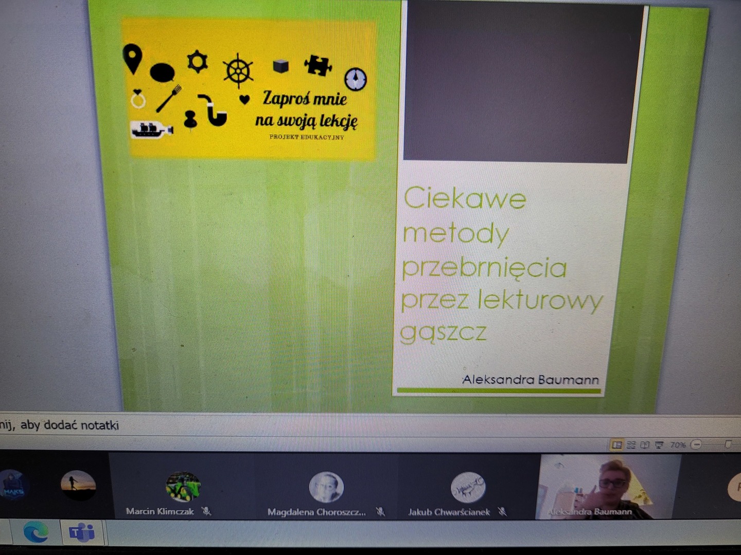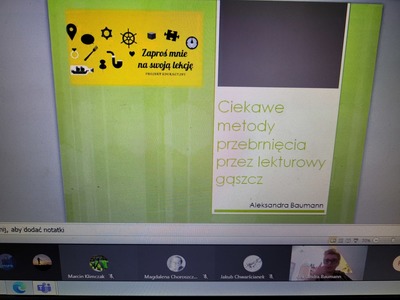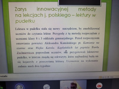 Podczas zajęć on line prowadzonych przez panią Aleksandrę Baumann uczniowie poznali bardzo przyjemne metody pracy z lekturą szkolną - metoda "lektury w pudełku" czy "metody stacji zadaniowych, czyli podróż z przygodami".