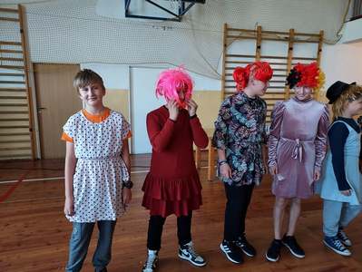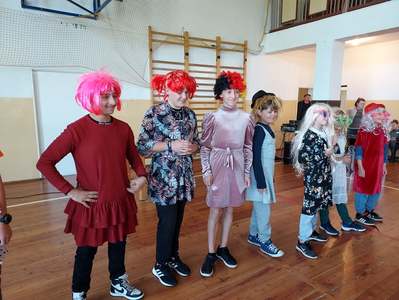 Odbył się również pokaz mody kobiecej w męskim wykonaniu. Wszyscy chłopcy prezentowali się przepięknie w damskich kieckach i kolorowych perukach