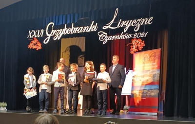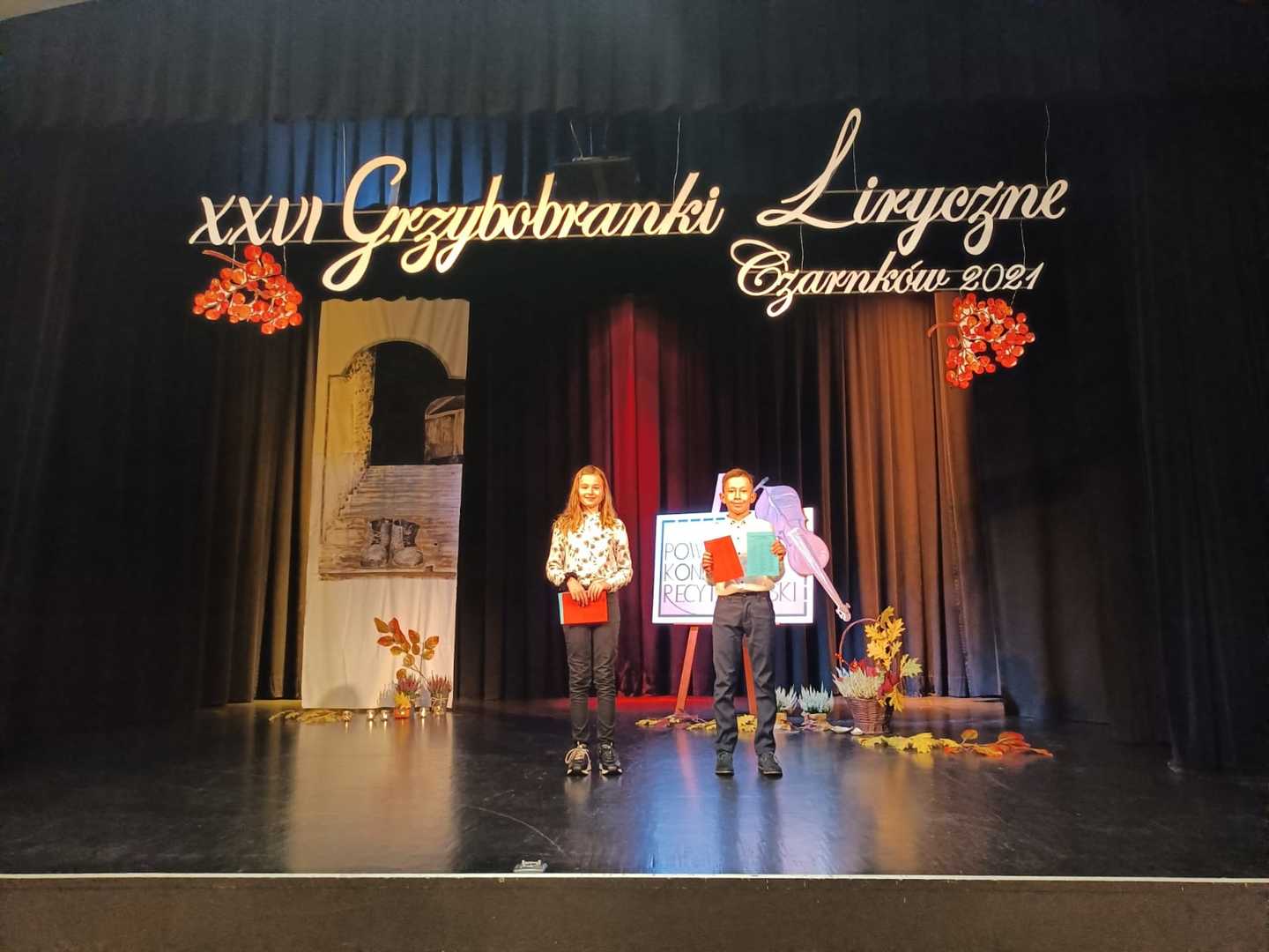 Mimo niesprzyjającej pogody, 21 października 2021 r., wspólnie z uczniami klasy czwartej – Kingą Winniczuk i Maciejem Sikorą, postanowiliśmy wybrać się na „grzybobranie” do... Miejskiego Centrum Kultury w Czarnkowie. Odbywały się tam bowiem XXVI Grzybobranki Liryczne, których częścią jest powiatowy konkurs recytatorski Kochać poezję.