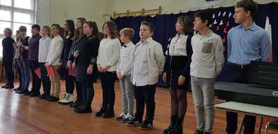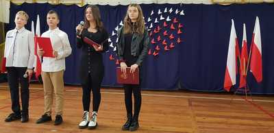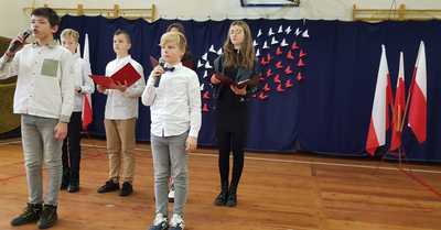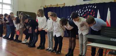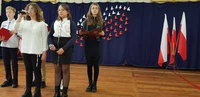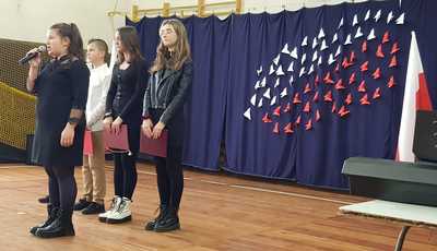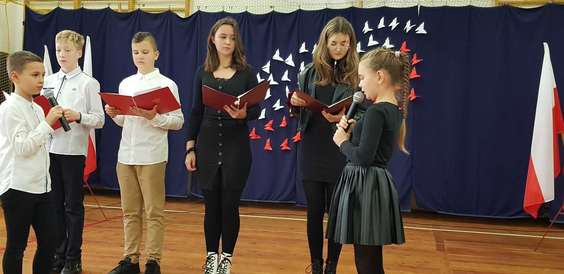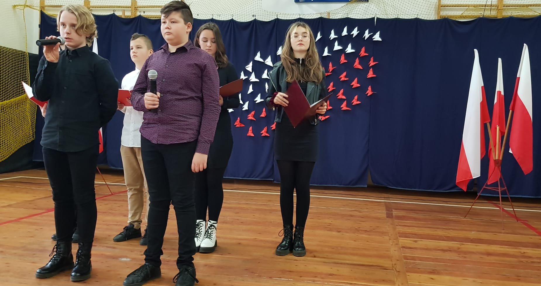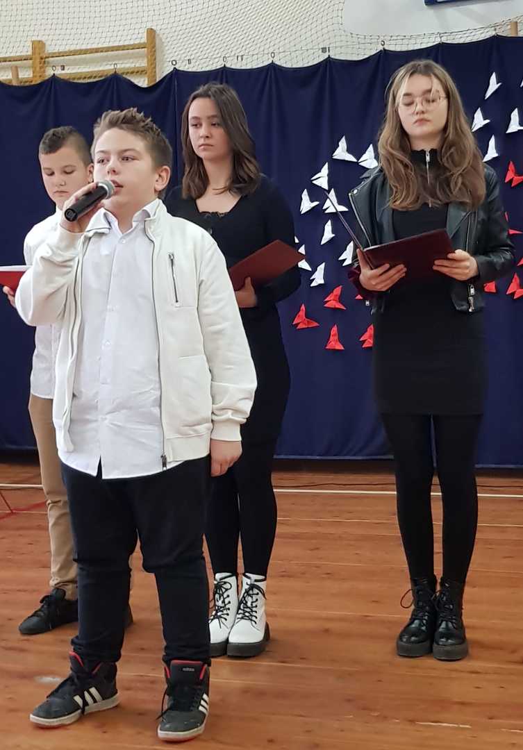 Na scenie mogliśmy zobaczyć Amelię Ignatowicz i Oliwkę Wicher, które zarecytowały wiersz Krzysztofa Kamila Baczyńskiego „Byłeś jak...”. Gabriel Szutkowski i Maciej Paszkiewicz z mocą i przekonaniem powiedzieli „Śpiew włościan krakowskich”. Wiersz Józefa Mączki „Wstań, Polsko moja!” pięknie zinterpretowała Alicja Andrzejewska, a Michał Rajek i Marcin Klimczak przedstawili historię dwóch Polaków z wiersza Edwarda Słońskiego „Ta, co nie zginęła...”. Wiersz Jerzego Żuławskiego „Do moich synów” powiedział Szymon Wadecki, a Jagoda Barłożek i Szymon Makowski z kl. III wyrecytowali wiersz Władysława Bełzy „Katechizm polskiego dziecka”.