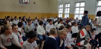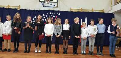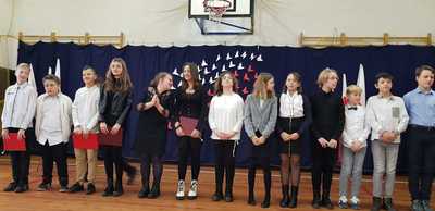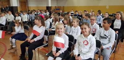 Jedno z najważniejszych świąt – odzyskanie przez Polskę niepodległości - uczciliśmy uroczystą akademią. Od 1918 r., kiedy Polska wróciła na mapy Europy po 123 latach zaborów, minęły 103 lata. Dzisiaj przypomnieli nam o tym uczniowie klasy VII, którzy pod opieką p. J. Napierały, przygotowali krótką lekcję historii o tym, dlaczego Polska utraciła suwerenność i w jaki sposób ją odzyskała.