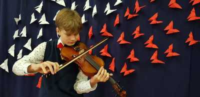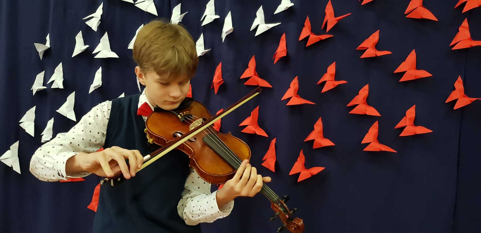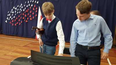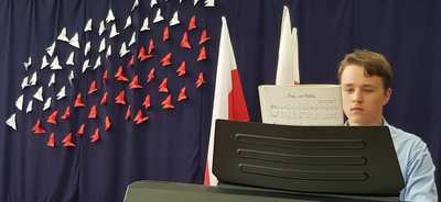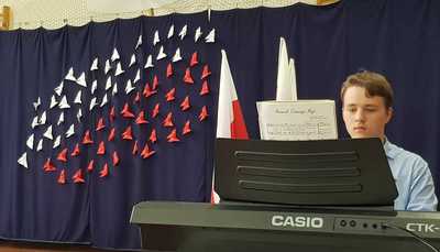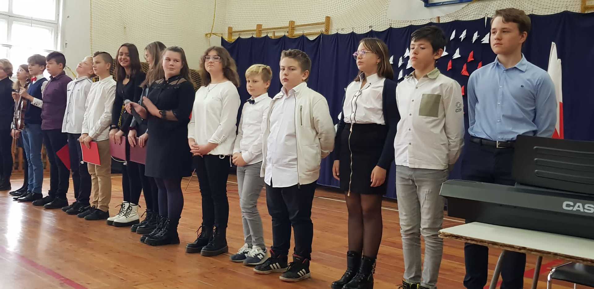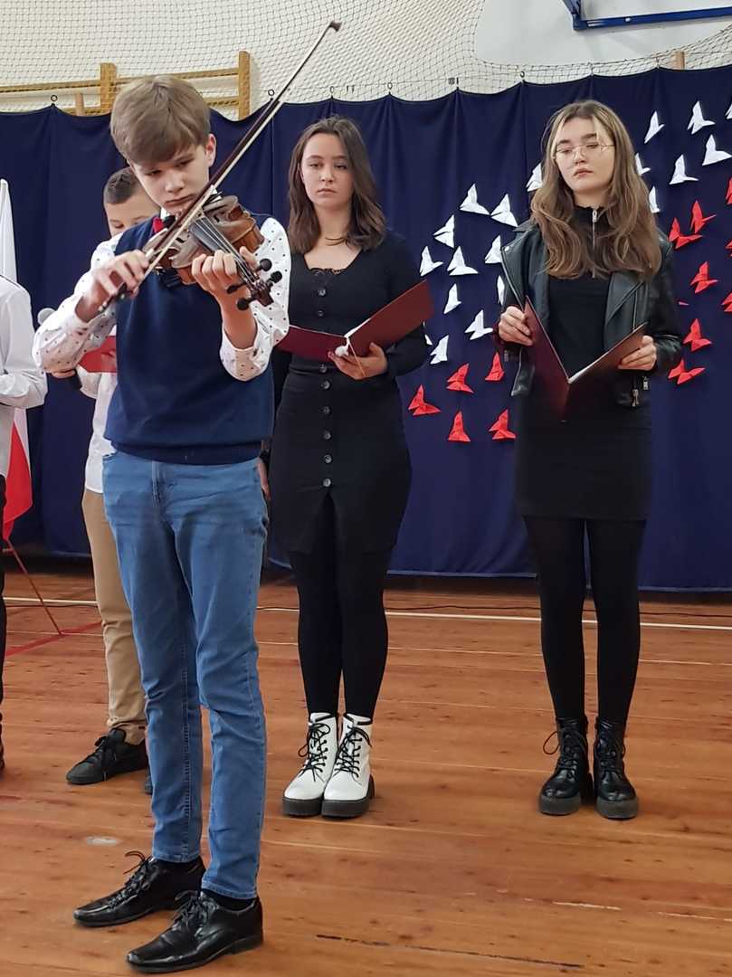 Piękne interpretacje były uświetnione grą naszych kolegów. Igor Sobczyński doskonale zagrał na skrzypcach fragment „Pierwszej Brygady”, a Jan Rajek z kl. VIII b idealnie wykonał na keyboardzie fragmenty trzech utworów: „Ułani, ułani”, „Marsz, marsz, Polonia” oraz „Polska nie sługa”.
