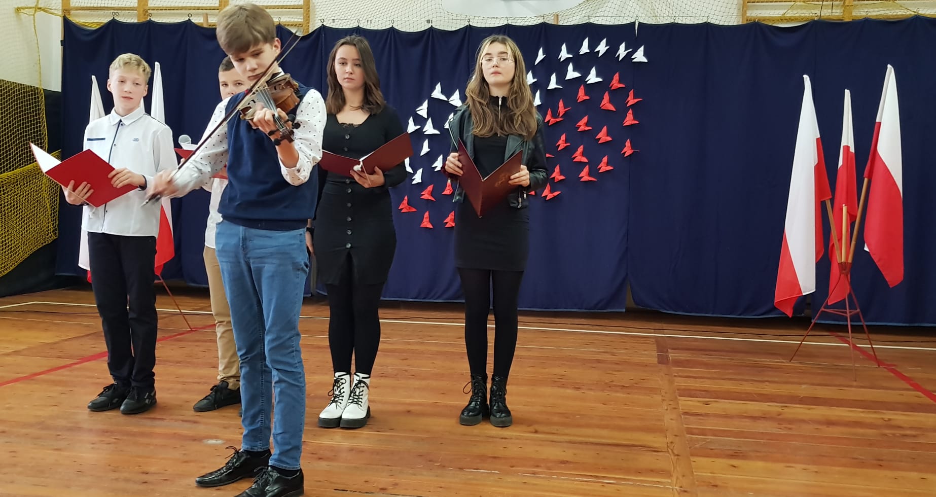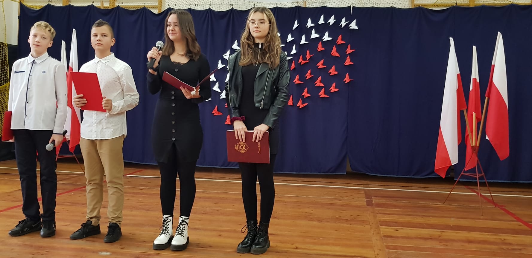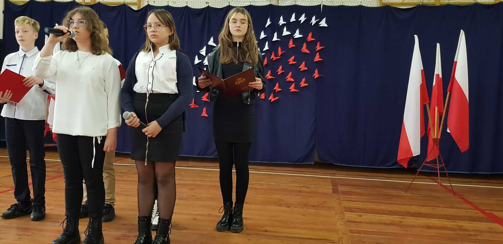 Po wspólnym odśpiewaniu „Mazurka Dąbrowskiego” uczniowie: Blanka Barłożek, Gabriela Jankowska, Jakub Chwarścianek i Maksymilian Szadzik – występujący w roli narratorów – przeprowadzili nas przez przeszło sto lat naszej historii.