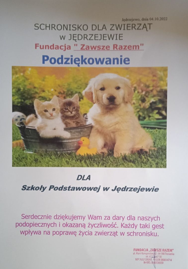 4 października br. z okazji Światowego Dnia Zwierząt uczniowie klasy 1 i 2 udali się z wizytą do schroniska w Jędrzejewie. W prezencie dla mieszkających tam, bezdomnych zwierząt dzieci zaniosły zebrana wcześniej karmę. Szczególne podziękowania za okazane serce dla uczniów klasy 1,2,3b,5 i 8. AD