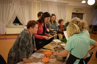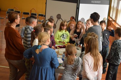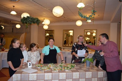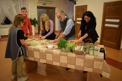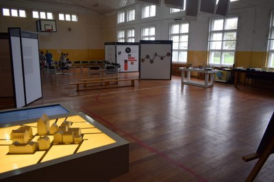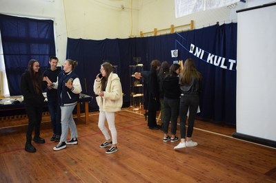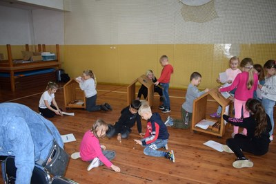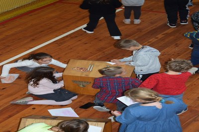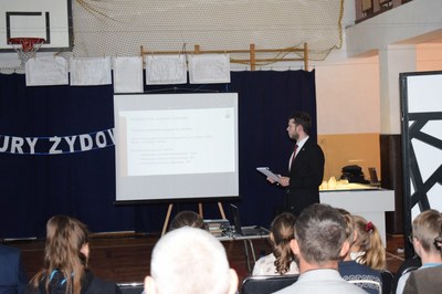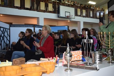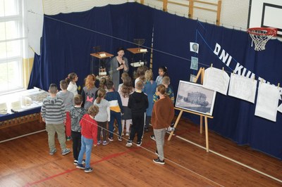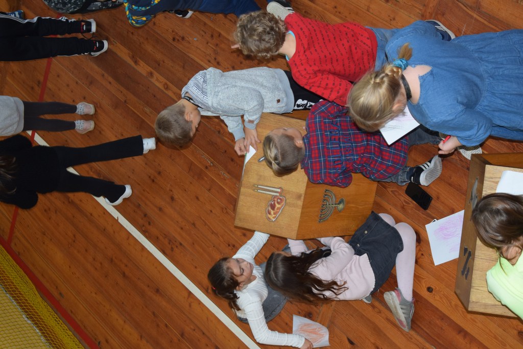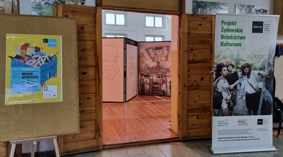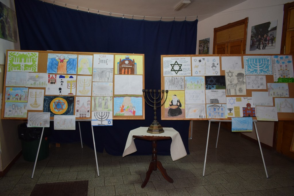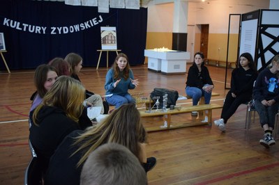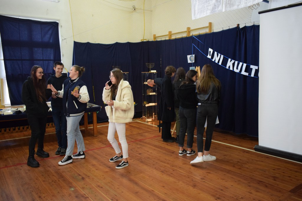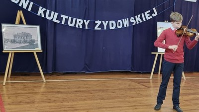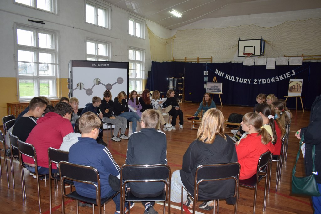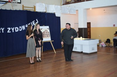 W dniach 18-20 października w Jędrzejewie gościliśmy MUZEUM NA KÓŁKACH. Ta wystawa edukacyjna warszawskiego muzeum POLIN od 2014 r. odwiedza miejscowości do 50 tys. mieszkańców, aby przybliżyć historię ludności żydowskiej w Polsce z uwzględnieniem kontekstu lokalnego. W tym roku znaleźliśmy się wśród 10 miejsc w Polsce, które spotkał ten zaszczyt. Muzeum Polin zapewniło wystawę stałą oraz edukatorów. Nasz udział polegał na zorganizowaniu imprez towarzyszących – w naszym przypadku był to konkurs plastyczny, wystawa judaików z Wielkopolski, koncerty, wykłady historyczne oraz wieczór z kuchnią żydowską. Koordynatorami przedsięwzięcia byli Pan Robert Zimny i Sebastian Pisowodzki, a partnerem Szkoła Podstawowa w Jędrzejewie. Sala wiejska zamieniła się na trzy dni w centrum kultury przez duże K. Z naszego zaproszenia, oprócz klas I-VIII naszej szkoły, skorzystały placówki edukacyjne z Powiatu czarnkowsko-trzcianeckiego – SP nr 2 w Trzciance, SP nr 2 w Wieleniu, SP w Sarbii, Przedszkole w Jędrzejewie, Liceum Ogólnokształcące w Czarnkowie oraz Zespoły Szkół Ponadpodstawowych w Wieleniu i w Czarnkowie. Każda z grup miała poziom warsztatów dostosowany do wieku uczestników. Na szkolnym holu pojawiła się wystawa z pracami uczniowskimi, a w sali sportowej interaktywna makieta, plansze edukacyjne, stół warsztatowy, budki do odwzorowań symboli żydowskich dla dzieci oraz regionalne gabloty i judaika. W środę na sali pojawili się pracownicy muzeów i regionaliści ( w osobach Pawła Krajewskiego, Karoliny Rążewskiej - Golik oraz Roberta Grzebyty), którzy opowiedzieli o historii społeczności żydowskiej Trzcianki, Czarnkowa i Wielenia. Przybyli też zaproszeni goście – samorządowcy, nauczyciele, kierownicy jednostek, rodzice i przedstawiciele samorządu uczniowskiego. Warto podkreślić obecność Przewodniczącej Wielkopolskiej Gminy Żydowskiej, Pani Alicji Kobus. Na scenie usłyszeliśmy wokalistkę, Panią Aleksandrę Gąsiorowską i Igora Sobczyńskiego (skrzypce), którzy klimatycznymi i wzruszającymi utworami wprowadzili nas w nastrój tego wieczoru. Po części historycznej w lokalu CELINECZKA Państwa Celiny i Marcina Nowaków rozpoczęliśmy warsztaty kulinarne. Podzieleni na 4 grupy w asyście niesamowitych Pań z Koła Gospodyń Wiejskich w Jędrzejewie przygotowywaliśmy kugel, gefilte fisz, szakszukę i gęsie pipki. Spróbować można było także tradycyjnie przygotowywany (24 godziny) czulent. Do kawy pojawiły hamantasze i pascha. Można powiedzieć, że była to kuchnia żydowska na wesoło. W rozmowach kuluarowych dominowały tematy kolejnych spotkań z historią i kulturą w nieco zmodyfikowanej formule. W ostatnim dniu odbył się koncert dla młodzieży z udziałem artystów związanych z Ośrodka Kultury w Budzyniu – śpiewali: Laura Mendel, Kamila Górna i Jakub Herfort (zwycięzca IX edycji MAM TALENT).