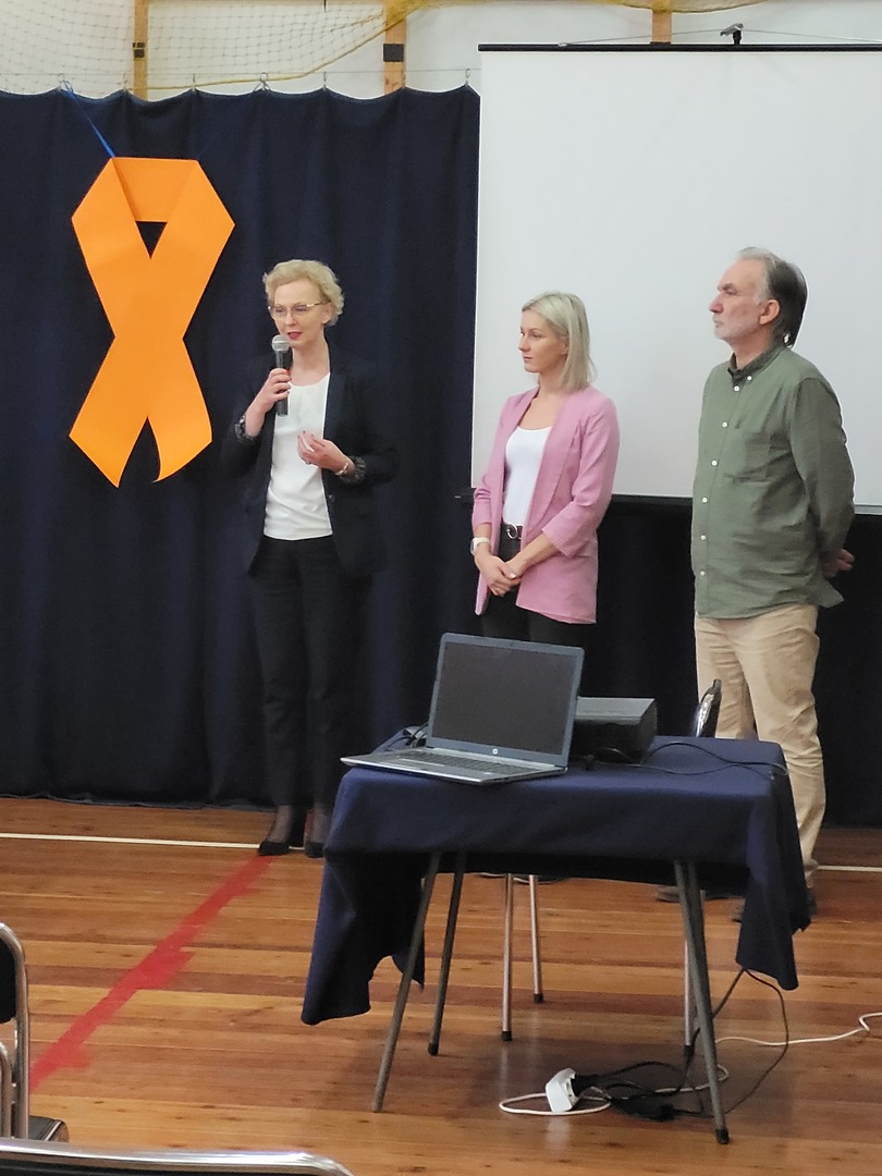 Agresja i przemoc w placówkach oświatowych to bardzo trudny i poważny temat, dlatego swoją wiedzą praktyczną podzielili się prelegenci - kurator Sądu Rejonowego w Trzciance p. Agnieszka Klepianowska, asp. szt. KPP w Czarnkowie p. Izabela Kolasa oraz pracownik CUS p. Anna Wybraniec.