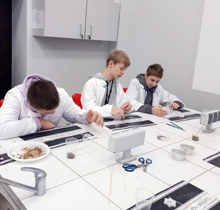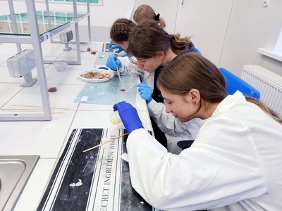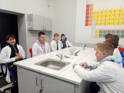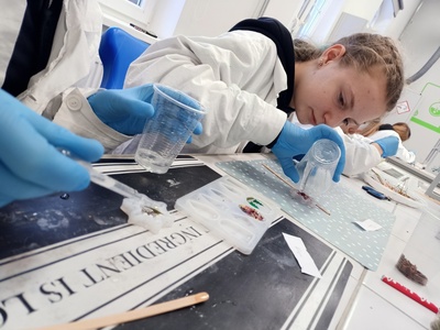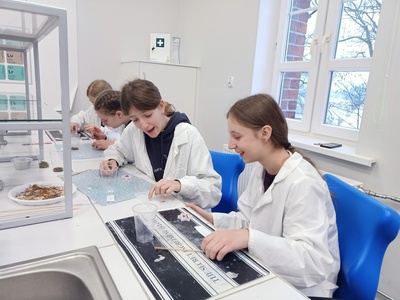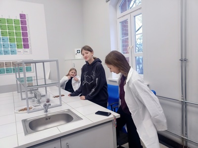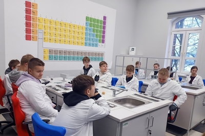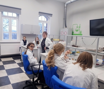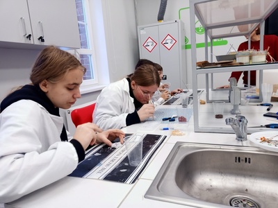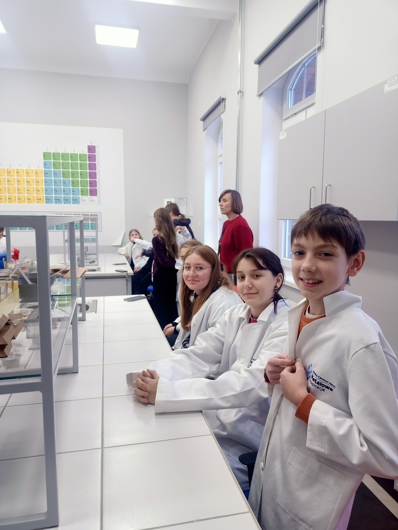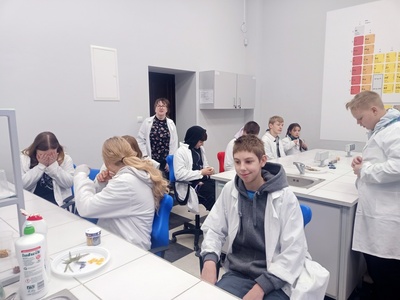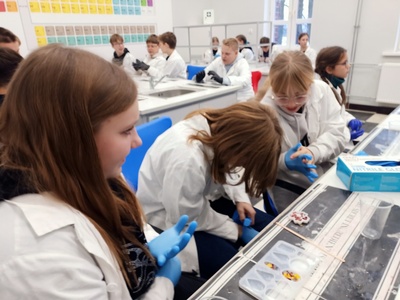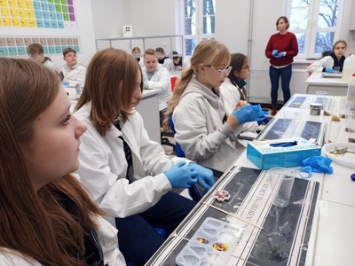 Pierwsze zajęcia to warsztaty w pracowni chemicznej, podczas których uczestnicy samodzielnie wyrabiali zawieszki i breloki z żywicy syntetycznej.