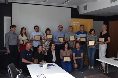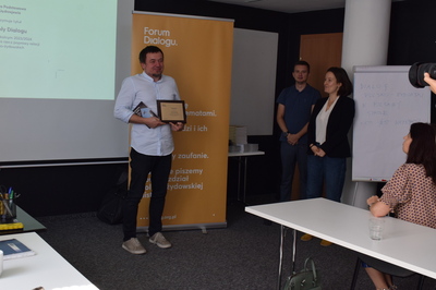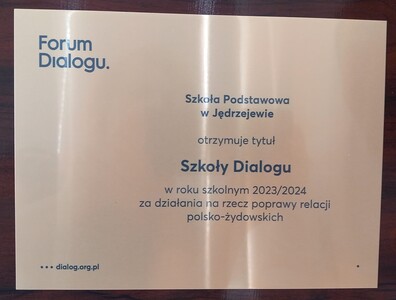 W niedzielę 22 września Pan Dyrektor Robert Zimny imieniu społeczności szkolnej Jędrzejewa odebrał tytuł SZKOŁY DIALOGU. Szkoła Podstawowa w Jędrzejewie znalazła się w elitarnym gronie 18 placówek z całej Polski, które w roku szkolnym 2023/2024 zrealizowały projekt i wypełniły wszystkie kryteria określone regulaminem. Przypomnijmy w skrócie, że nasi uczniowie wzięli udział w ogólnopolskiej akcji ŻONKILE, uczestniczyli w warsztatach MIASTECZKO MALKI odwiedzili Gminę Żydowską i Archiwum Państwowe w Poznaniu, nawiązali kontakt z żydowską rodziną Putziger (która mieszkała w Jędrzejewie ponad 100 lat), przeszli turystycznym Szlakiem Czarnkowskich Żydów, wyjechali do Bydgoszczy i Fordonu gdzie zobaczyli zachowaną synagogę i kuczkę. Zwieńczeniem Projektu było opracowanie ulotki. Uroczysta gala połączona z warsztatami odbyła się w Warszawie. Nasza Szkoła otrzymała piękną tabliczkę, a uczniowie zostaną nagrodzeni niespodziankami. Koordynatorem projektu i fundatorem nagród było Forum Dialogu. Serdecznie dziękujemy za wyróżnienie !!!!