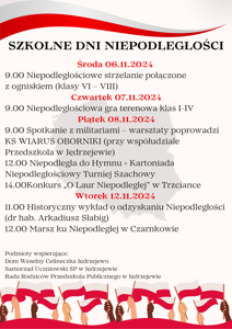 SZKOLNE DNI NIEPODLEGŁOŚCI Zdjęcia Zobacz również Pogram profilaktyczny DEBATA 19 Dni Przeciwko Przemocy / Dzieciństwo Mocy Bez... Nowe logo szkoły SZKOLNE DNI NIEPODLEGŁOŚCI CEL!!! OGNIA!!! GRA TERENOWA „ŚLADAMI NIEPODLEGŁEJ” 05 listopada 2024 Aktualności Wydrukuj Udostępnij Wyświetlono: 39