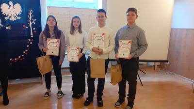 W ramach SZKOLNYCH DNI NIEPODLEGŁOŚCI reprezentacja naszej szkoły w składzie Zuzanna Choroszczak, Jakub Wicher, Maksymiliana Olesiuk (oraz rezerwowa Kinga Winniczuk) wzięła udział w II edycji konkursu „O LAUR NIEPODLEGŁEJ” organizowany przez Szkołę Katolicką w Trzciance im. św. Siostry Faustyny. Uczniowie pod okiem naszych nauczycieli – Barbary Pisowodzkiej, Roberta Grzebyty i ks. Andrzeja Jerzyny przygotowywali się z zakresu literatury, historii i muzyki. Nasza drużyna stanęła na wysokości zadania, wykazała się wiedzą, słuchem i refleksem i ostatecznie zajęła drugie miejsce . Organizatorzy przygotowali patriotyczną część artystyczną, a na koniec wszyscy uczestnicy zostali nagrodzeni. Skorzystaliśmy też z dodatkowej opcji wysłuchania referatu o polskiej monecie II RP oraz zwiedzania eksponatów Muzeum Parafialnego znajdującego się w piwnicach szkoły. Głównemu organizatorowi Andrzejowi Poniatowskiemu serdecznie dziękujemy.