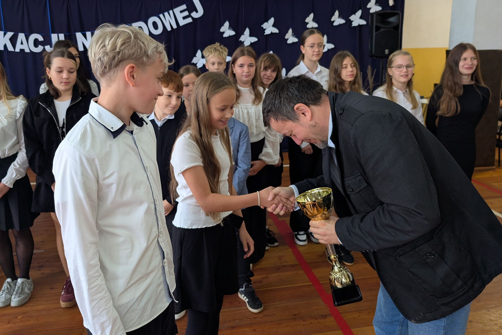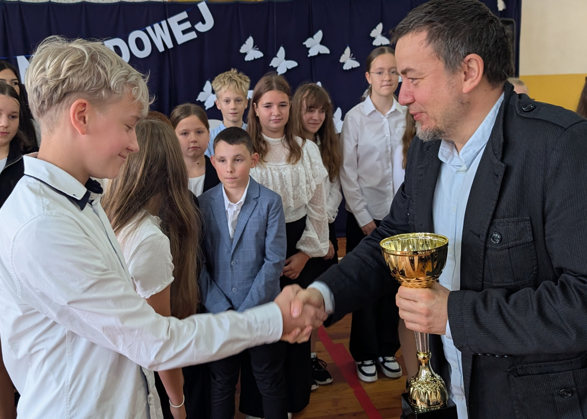 Nie zabrak艂o tak偶e sportowych emocji – reprezentacja szko艂y w biegach prze艂ajowych przekaza艂a panu dyrektorowi puchar zdobyty podczas zawodów 馃弳.