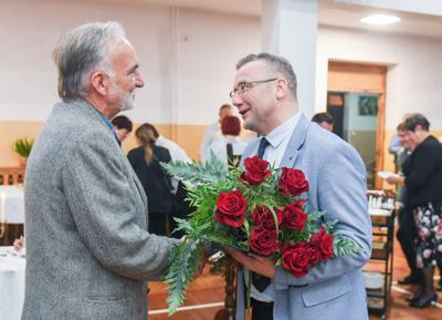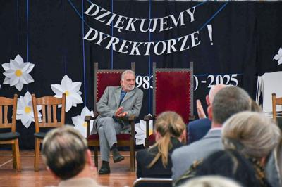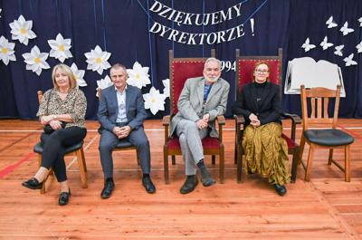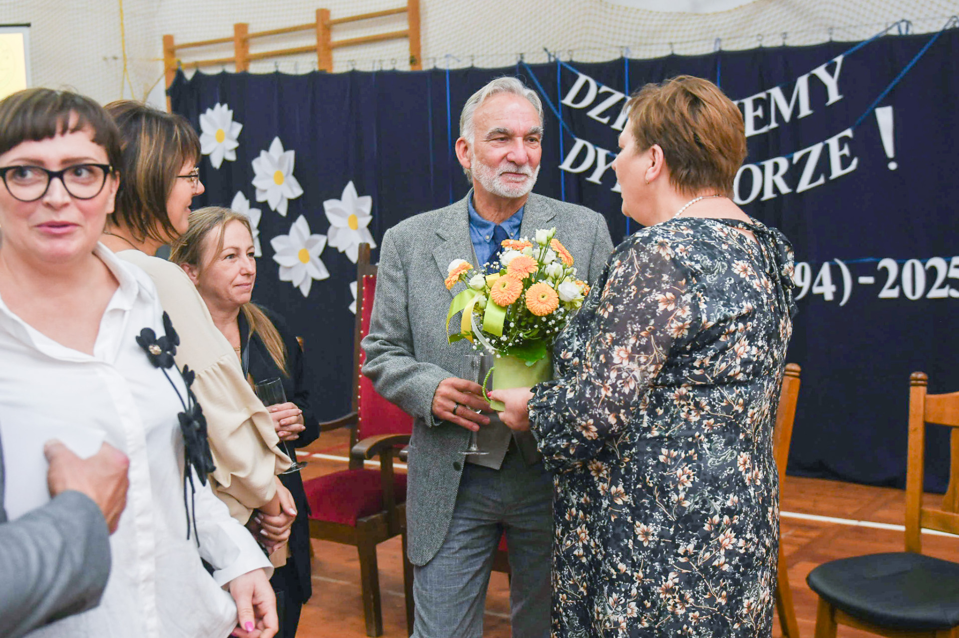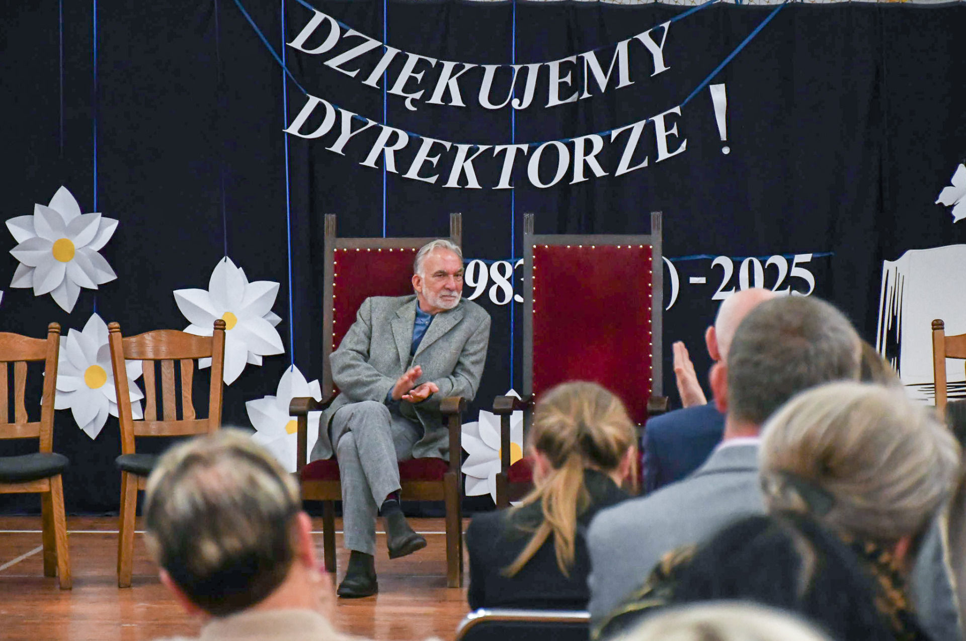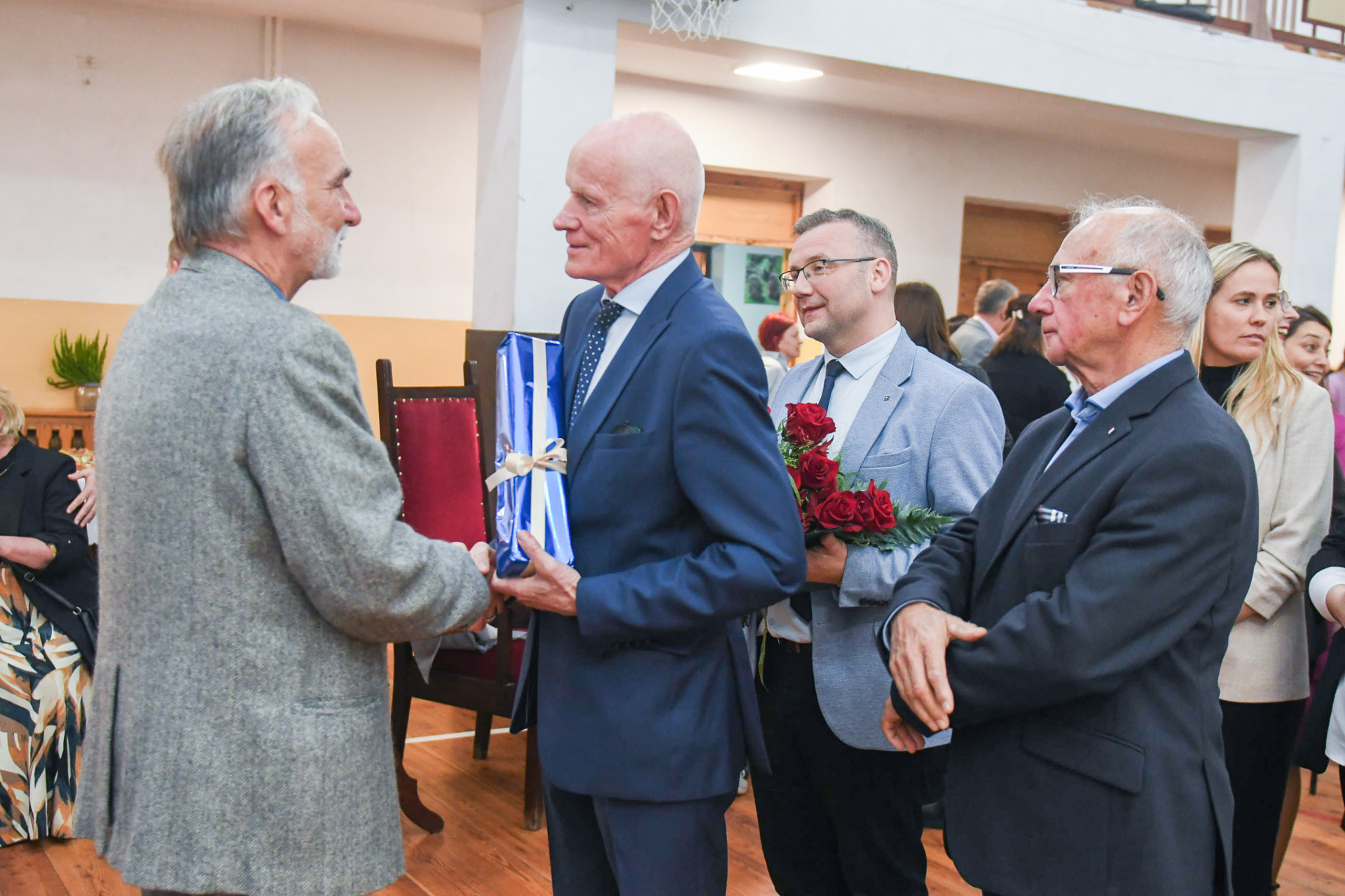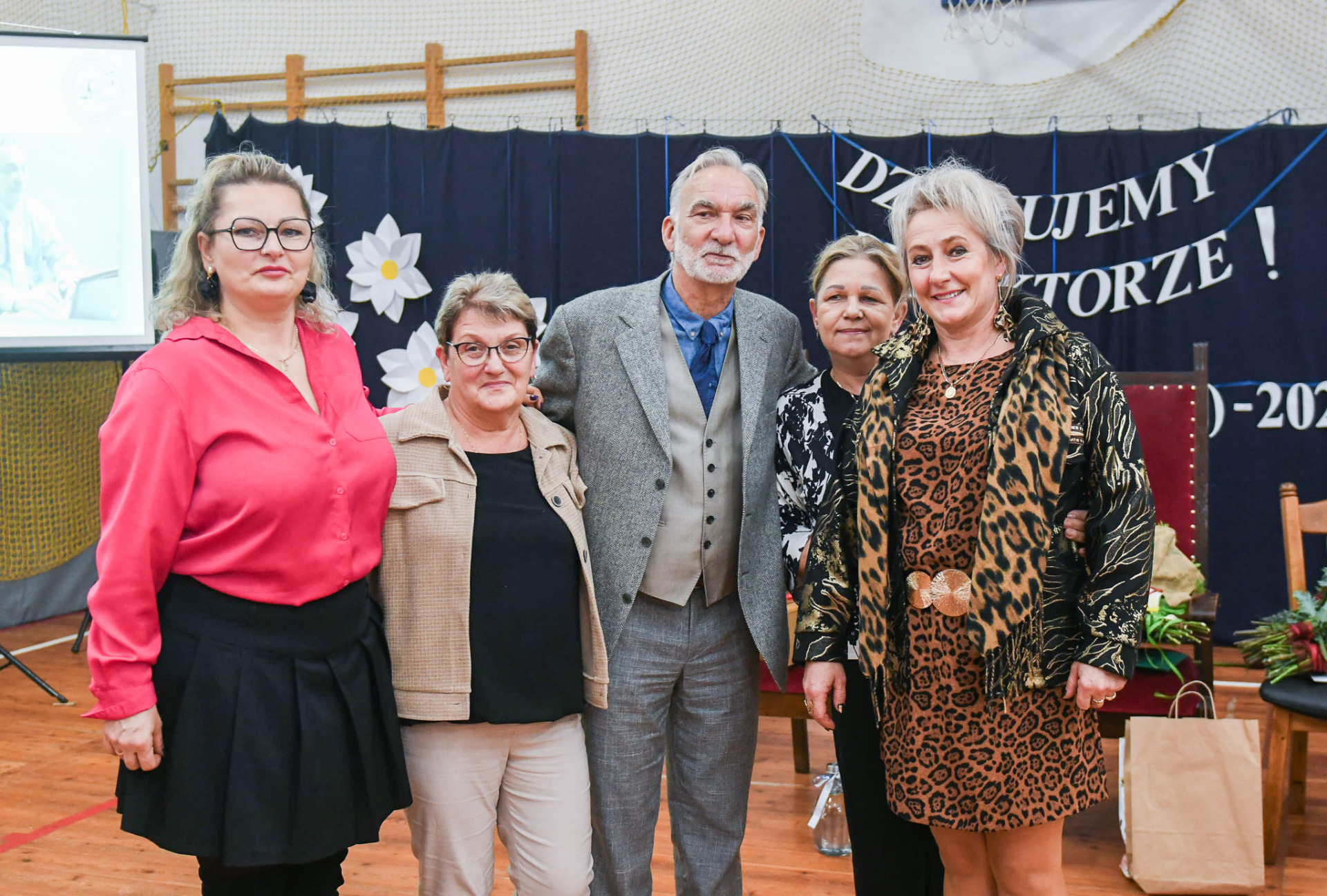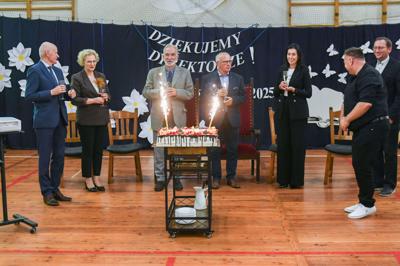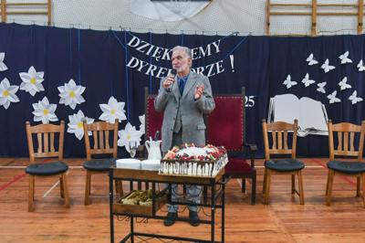 Czwartkowe popołudnie 9 października na pewno zapisało się w historii naszej szkoły. Tłumy pracowników i współpracowników podziękowało Dyrektorowi Sławomirowi Szymańskiemu, który podjął decyzję o przejściu na emeryturę. Pan Sławomir Szymański pracował w Szkole w Jędrzejewie od 1983 r., a funkcję dyrektora pełnił od 1994 r. Był nauczycielem fizyki i informatyki oraz wychowawcą. Sprawnie zarządzał placówką, co przełożyło się na liczne inwestycje, zainicjował i wspierał wiele projektów edukacyjnych - w tym te najcenniejsze dla społeczności uczniowskiej - związane ze współpracą ze szkołami aż 4 krajów: Słowacji, Czech, Gruzji i Szwecji. Skutecznie rozwiązywał pojawiające się problemy i miał dobry kontakt ze współpracownikami, Radą Rodziców i organem prowadzącym. Potwierdziły to liczne wspomnienia zaproszonych gości podczas spotkania. A co do samej uroczystości – planowaliśmy ją od kilku miesięcy. Na zaproszenie zareagowano bardzo pozytywnie i na sali sportowej pojawili się emerytowanie pracownicy, koledzy z pracy, obecni pracownicy szkoły, dyrektorzy szkół Gminy Czarnków, działacze związkowi, samorządowcy i przyjaciele. Spotkanie otworzył Dyrektor Szkoły Pan Robert Zimny i już po kilku minutach nastąpiła pierwsza z niespodzianek – na sali pojawili się przedstawiciele zaprzyjaźnionych szkół z Preselan i Sołcan (Słowacja). Zaskoczenia, owacja i wzruszenie. Nasz główny bohater zasiadł na honorowym miejscu, a prowadzący przybliżył sylwetkę Dyrektora Szymańskiego. Po chwili za sprawą skrzypaczki Michaliny Kowali przenieśliśmy się muzycznie do różnych krajów europejskich. W kolejnym punkcie przeplatały się wspomnienia z prezentacją – na ekranie zobaczyliśmy naszego szefa w różnych sytuacjach – i poważnych i zabawnych. Anegdoty, obrazy z przeszłości i osobiste refleksje dały nam wiele pozytywnych emocji. Na koniec zaśpiewaliśmy Panu Dyrektorowi Szymańskiemu tradycyjne STO LAT i wznieśliśmy toast za Jego zdrowie. Nasz bohater został poproszony o odsłonięcie swojej fotografii, która wzbogaci galerię dyrektorów przygotowywaną z okazji 80 – lecia szkoły. Na koniec delegacje mogły osobiście złożyć życzenia i wpisać się do pamiątkowej księgi. To był wspaniały wieczór – dziękuję wszystkim, którzy się przyczynili do zorganizowania tej wspaniałej uroczystości.