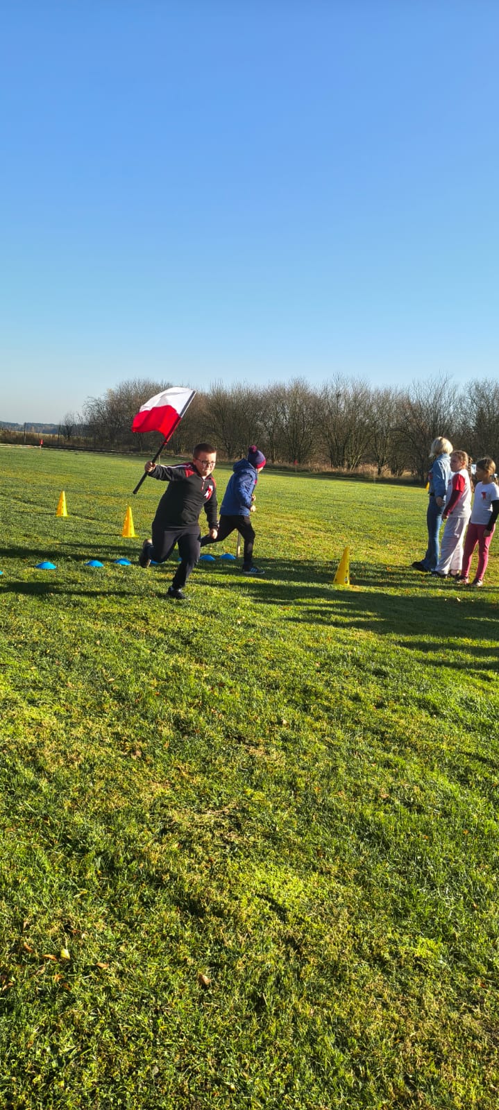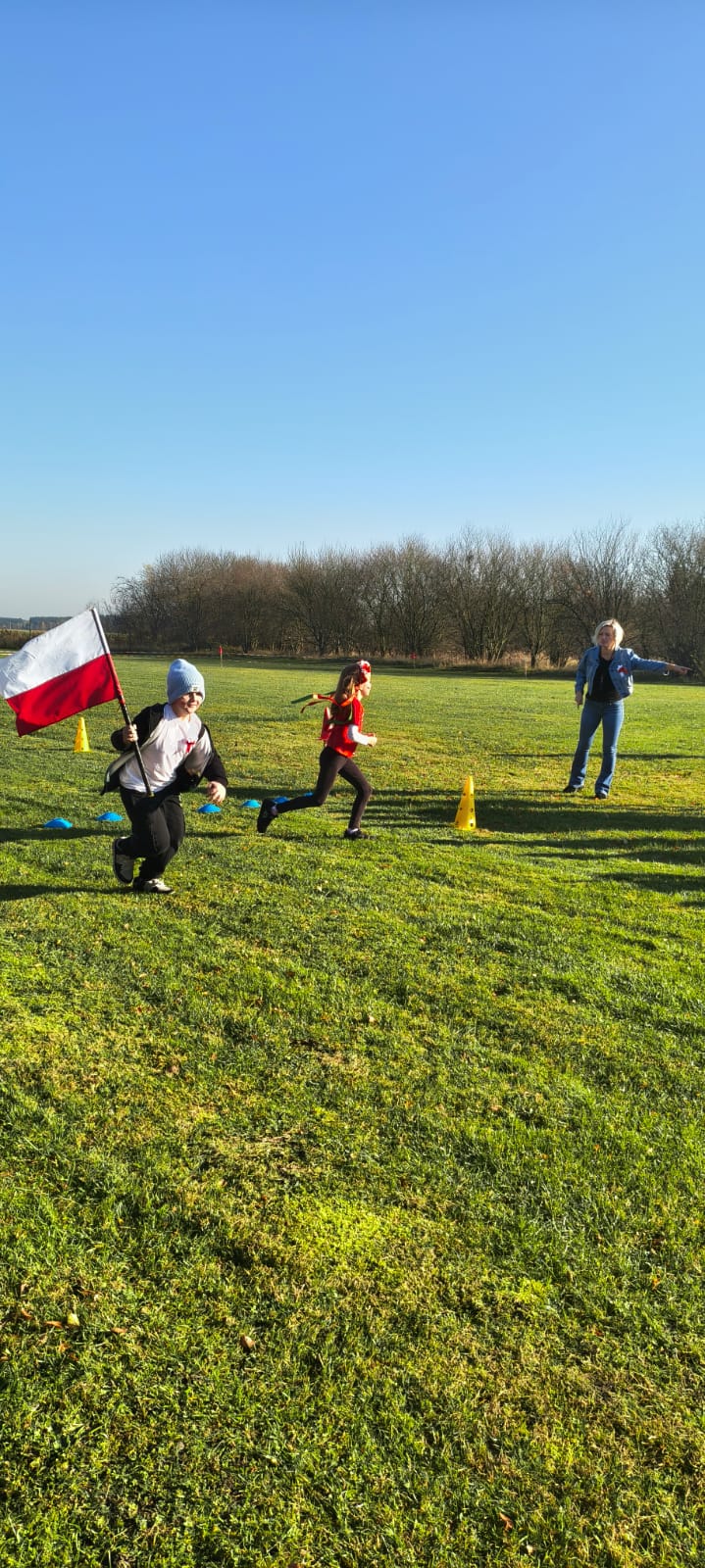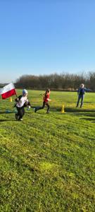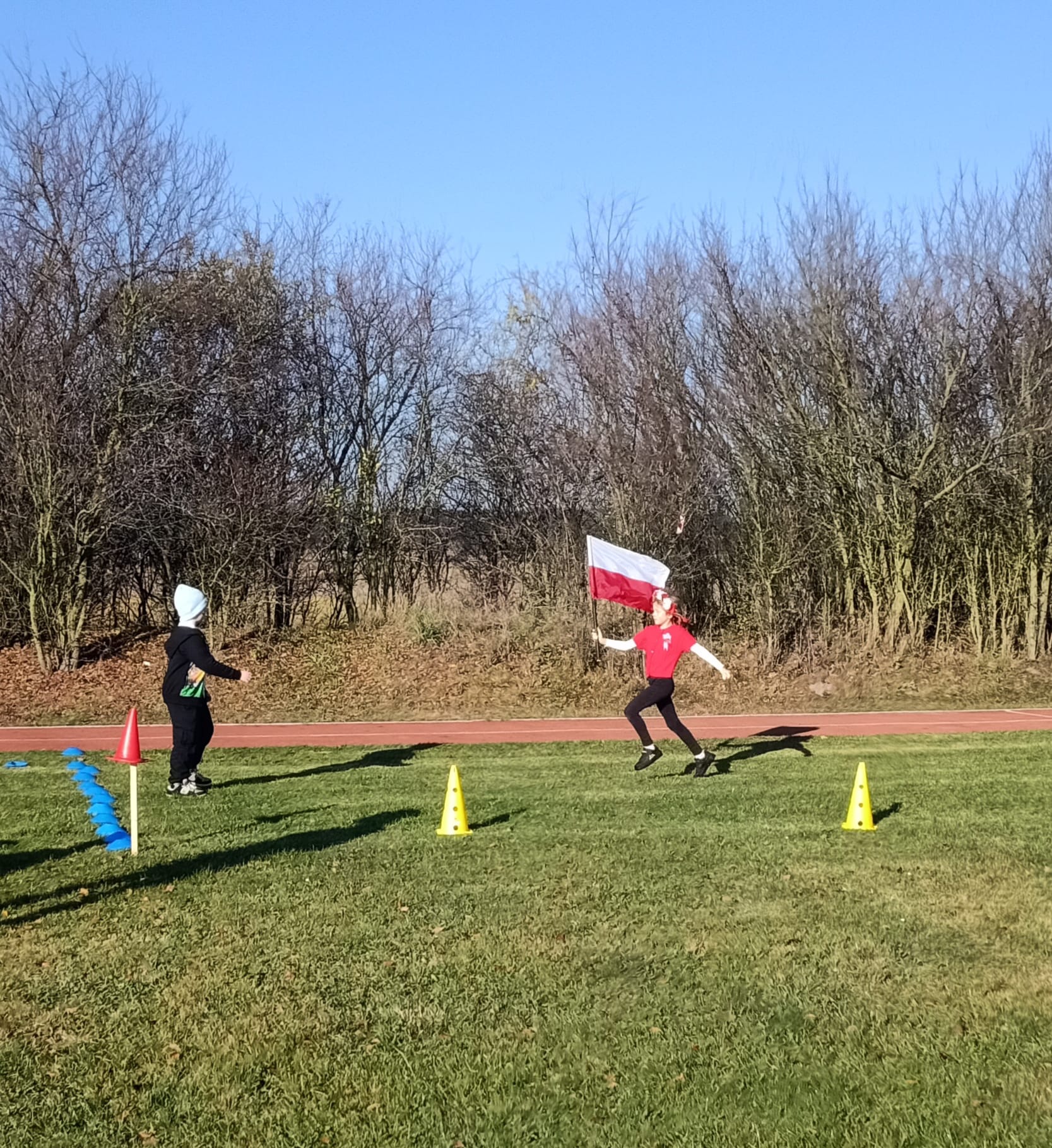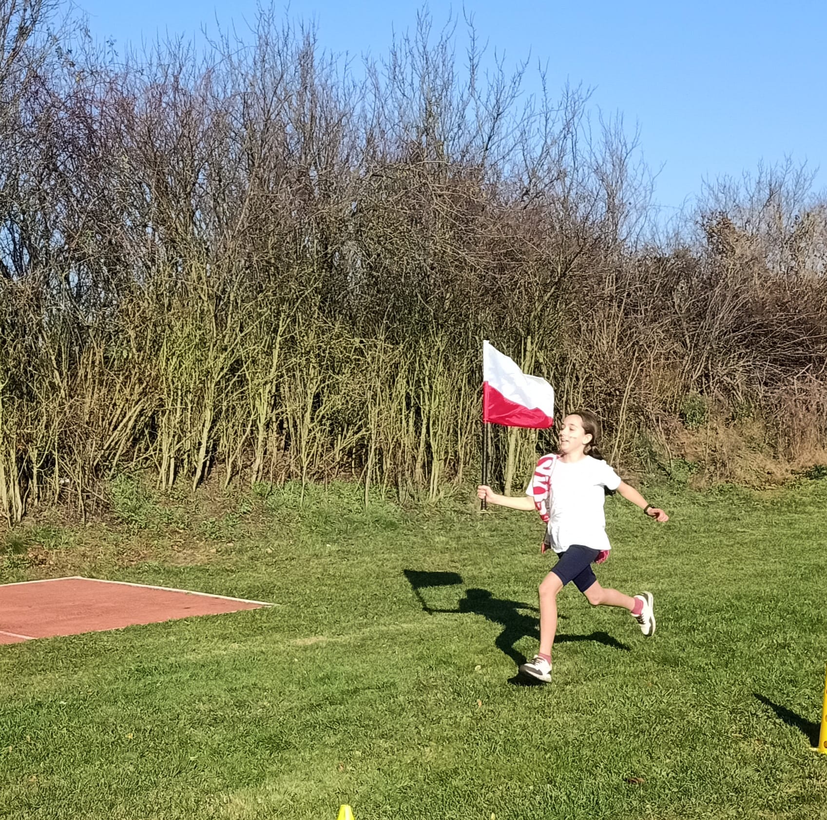 Następnym punktem obchodów był SZTAFETOWY BIEG Z FLAGĄ dla młodszych uczniów 100X107: aby upamiętnić 107 rocznicę odzyskania niepodległości, każdy ze stu siedmiorga uczniów pokonał dystans równy 100 m, przekazując flagę kolejnej osobie. I każdy z uczestników biegu, w obecności całej szkoły, mógł dumnie i uroczyście biec z Biało-Czerwoną.