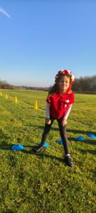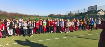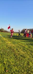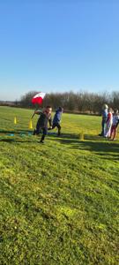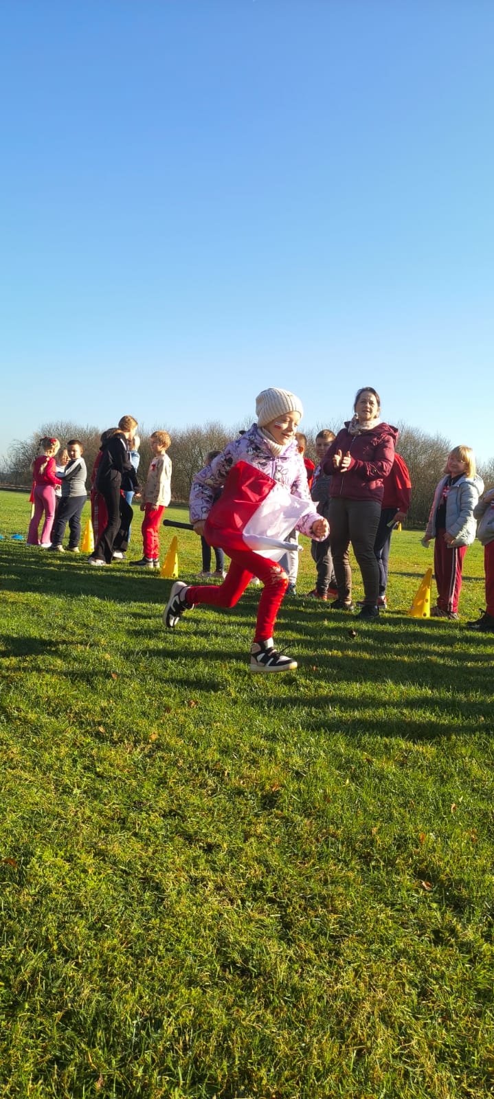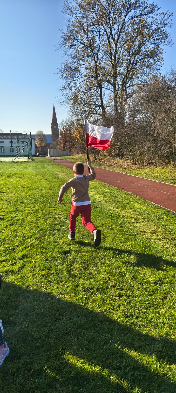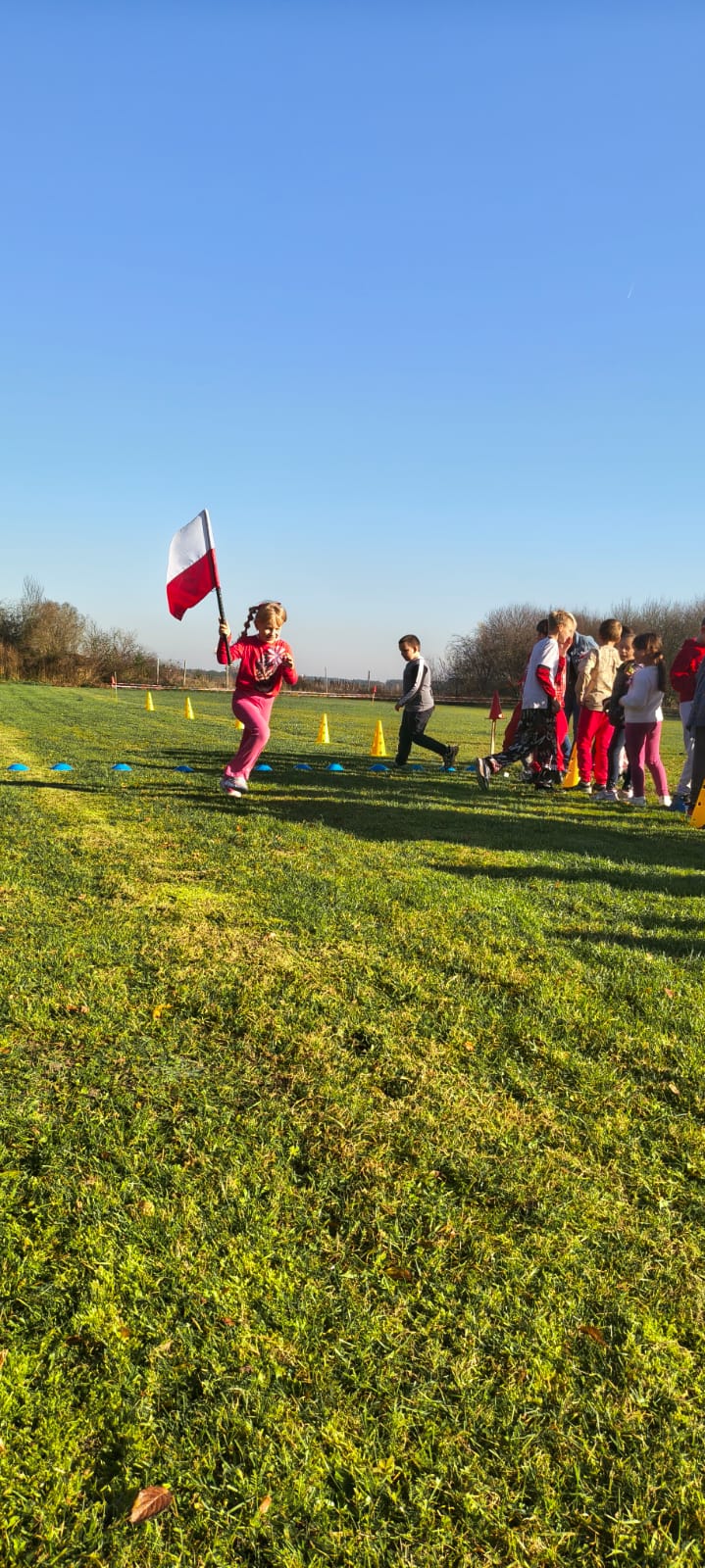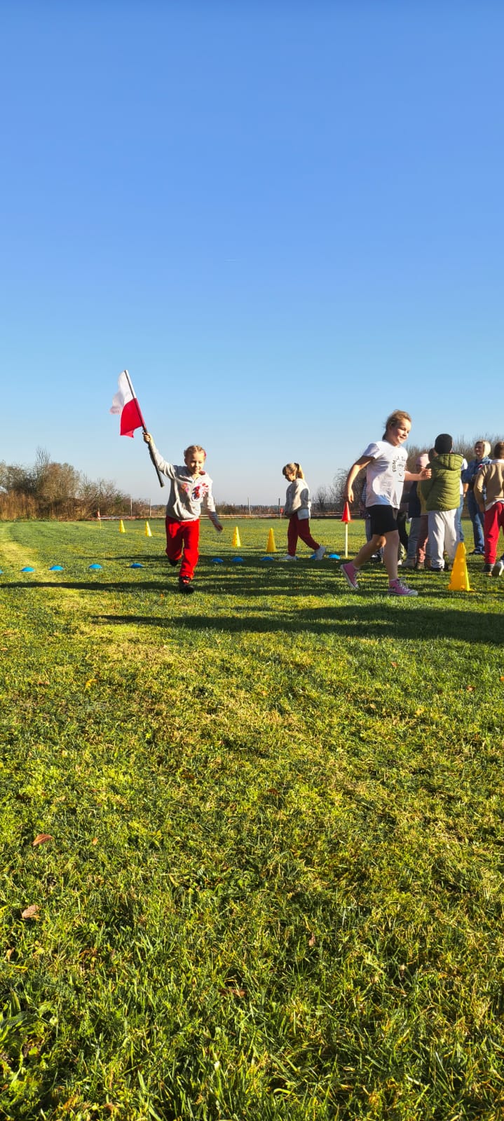 Następnym punktem obchodów był SZTAFETOWY BIEG Z FLAGĄ dla młodszych uczniów 100X107: aby upamiętnić 107 rocznicę odzyskania niepodległości, każdy ze stu siedmiorga uczniów pokonał dystans równy 100 m, przekazując flagę kolejnej osobie. I każdy z uczestników biegu, w obecności całej szkoły, mógł dumnie i uroczyście biec z Biało-Czerwoną.