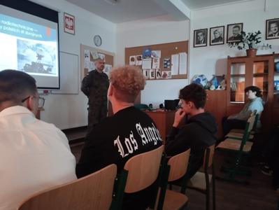 uczniowie starszych klas mogli dowiedzieć się w jaki, nowoczesny i zdalny sposób Wojsko Polskie pilnuje naszego bezpieczeństwa.