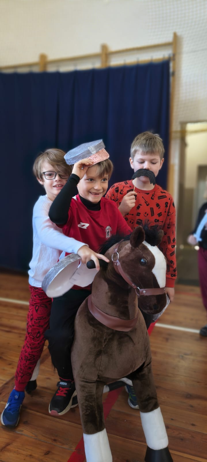 Po wykonaniu prac, dla wszystkich chętnych uruchomiliśmy „fotobudkę” gdzie uczniowie mogli zrobić sobie fotografię na koniu, z maciejówką wąsami i szablą.