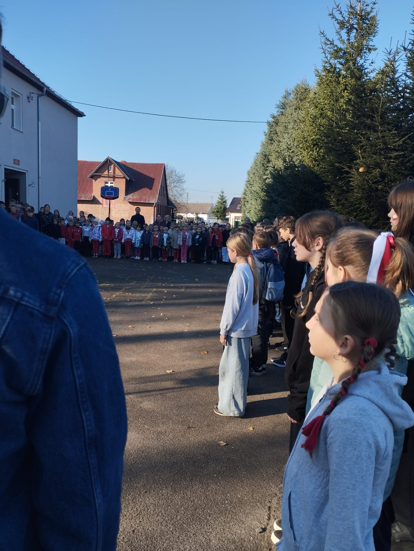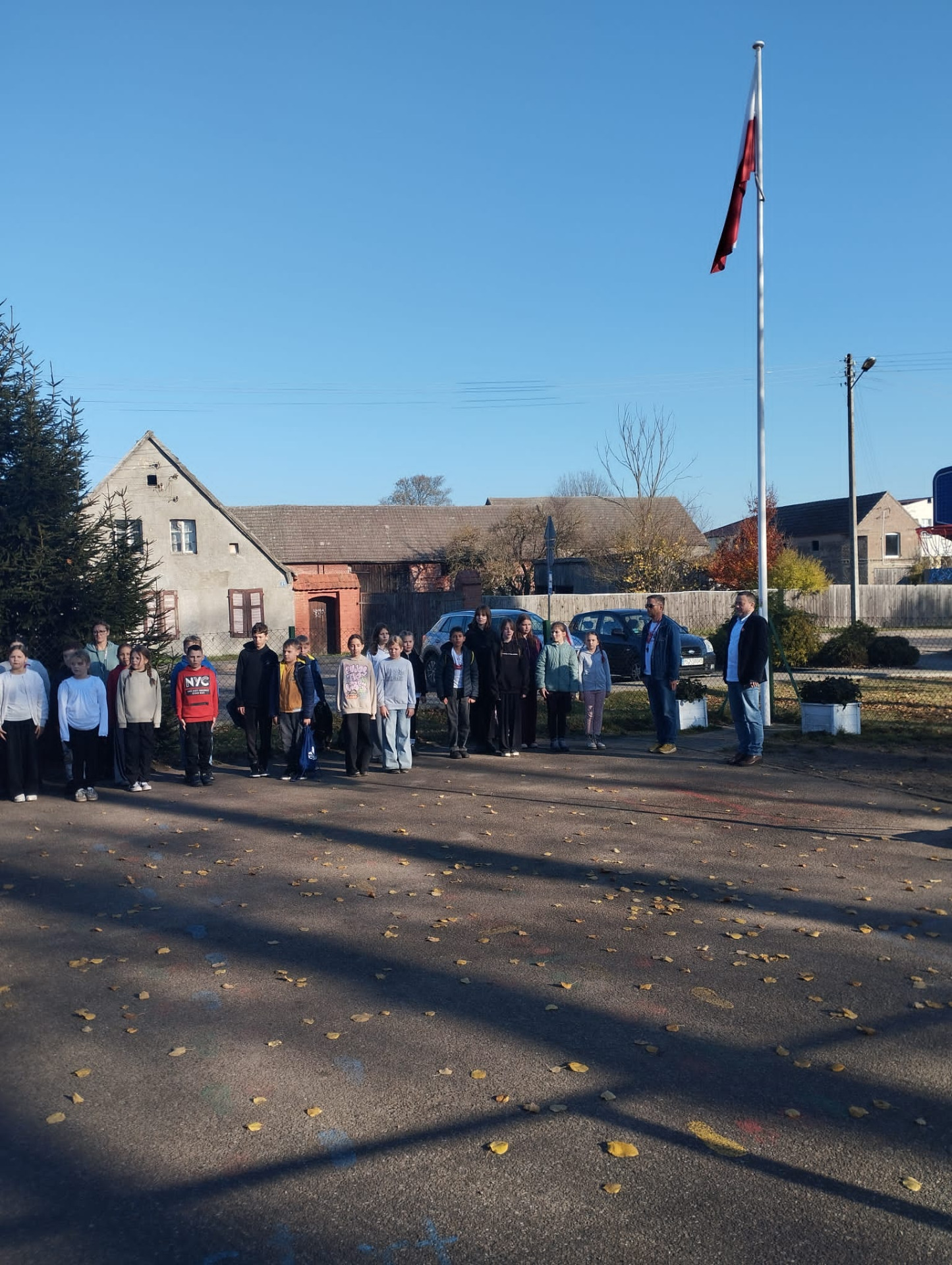 Na koniec dnia zgromadziliśmy się na placu szkolnym pod masztem, żeby, podobnie jak większość szkół w całej Polsce, wziąć udział w AKCJI „SZKOŁA DO HYMNU” i uroczyście odśpiewać Mazurka Dąbrowskiego.