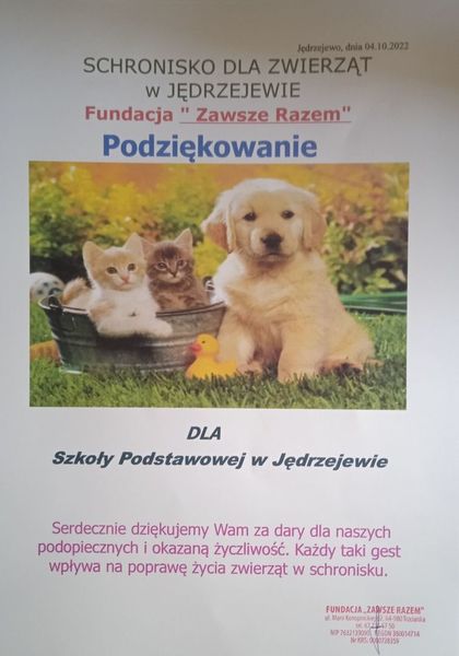 09 października 2022 Aktualności 4 Października Światowy Dzień Zwierząt 4 października br. z okazji Światowego Dnia Zwierząt uczniowie klasy 1 i 2 udali się z wizytą do schroniska w Jędrzejewie. W prezencie dla mieszkających tam, bezdomnych zwierząt dzieci zaniosły zebrana... Czytaj więcej